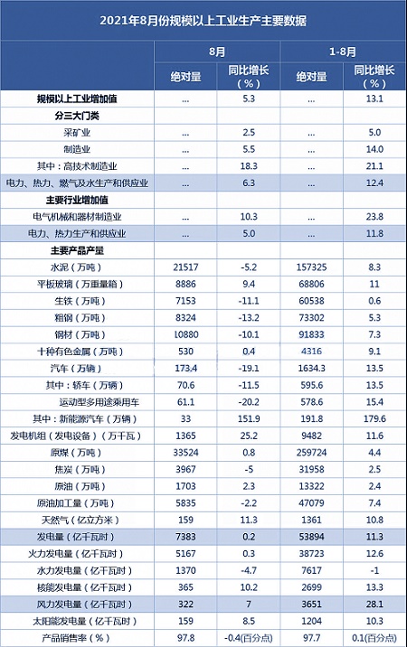 2021年8月份规模以上工业增加值增长5.3%