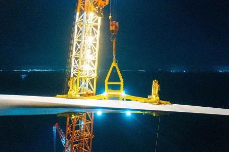 巨力索具此次研发的大兆瓦全角度旋转式海上单叶片吊具额定载荷50吨,吊装作业平均风速15m/s,最大阵风风速18m/s,极大拓宽了风机吊装窗口期,突破了海上吊装作业风速边界限制;吊具自带缆风系统,吊具主横梁具备-35°~+215°范围内带载旋转功能,可满足叶片变桨调节功能。