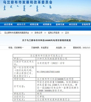 3月1日,乌兰察布市兴和县500MW风电项目获乌兰察布市发改委核准批复。