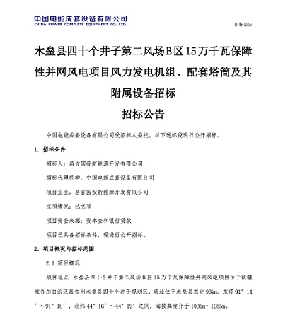 木垒县四十个井子第二风场B区15万千瓦保障性并网风电项目风力发电机组、配套塔筒及其附属设备招标公告显示,项目地点位于新疆维吾尔自治区昌吉州木垒县四十个井子规划区,采购容量为150MW,单机容量为5-6.5MW风力发电机组及配套塔筒。
