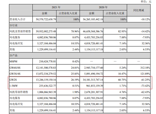 以金风科技和明阳智能为例,两家公司2021年都出现了小容量风机营收下降、大容量风机营收大幅增加的变化。两者都与“降本增效”需求下风机大型化的趋势紧密相关,后者还与海上风电2021年密集的交付有关。