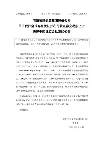 7月7日晚间,明阳智能发布公告,公司于近日收到中国证监会出具的《关于核准明阳智慧能源集团股份公司首次公开发行全球存托凭证(GDR)并在伦敦证券交易所上市的批复》。根据该批复,中国证监会核准公司发行全球存托凭证所对应的新增A股基础股票不超过1.68亿股,按照公司确定的转换比例计算,公司本次GDR发行数量不超过3366.05万份。转换比例调整的,GDR发行数量可相应调整。完成本次发行后,公司可于伦敦证券交易所上市。公司本次发行GDR并上市尚需取得英国证券监管机构和相关证券交易所的最终批准。
