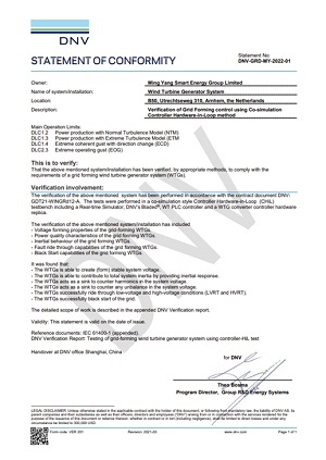 风机构网型功能开发属于跨学科综合课题,在明阳风能研究院推动下成立项目攻坚团队,汇集并网、变流器、主控算法、主控平台、载荷设计多名核心技术人员。本次测试明阳将MySE6.45MW机组主控PLC和变流控制器运往万里之外的位于荷兰arnhem的DNV实验室,并搭建了基于Bladed-Rtlab平台的机电电气耦合实时仿真平台,进行构网型功能开发及相关测试工作。与目前国内其他厂家验证风机在构网型控制算法下进行高低压穿越能力不同,明阳此次结合国内外多家机构研究结果以及各国并网准则的要求,联合DNV团队从电网需求出发结合MySE风机运行特性重新定义了风机构网型功能的要求。在DNV的推动下,明阳顺利完成了各项功能测试,测试结果各项功能指标均满足设计要求。