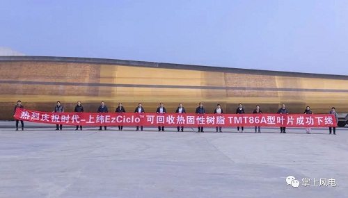 可回收热固性环氧树脂,可运用在壳体、大梁、腹板等叶片部件中,由其制成的复合材料部件,到了使用年限可回收降解,经过降解技术整理再利用,再次制成玻纤或碳纤复合材料。整个过程减少原材料的消耗,为推动绿色循环经济找到一条可回收再利用的解决方案。