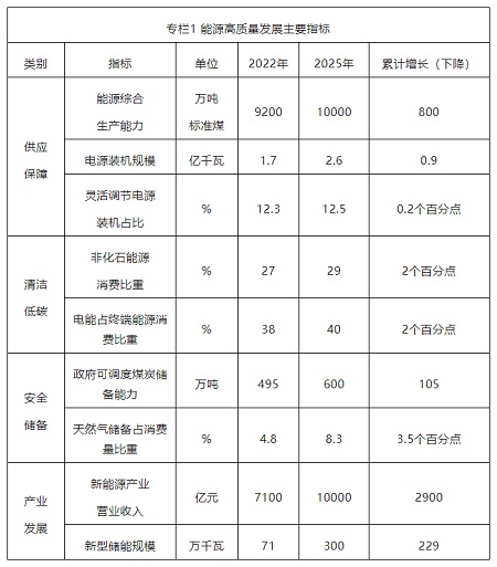 到2025年,能源高质量发展取得重大进展,能源安全保障能力大幅提升,能源绿色低碳转型成效显著,能源发展新模式新业态竞相迸发,关键核心技术自主创新实现突破,重点领域、关键环节改革取得实质性进展,协同配置资源能力有序顺畅,能源发展更有效率、更加公平、更可持续,更好地满足人民群众美好生活用能需要。多元安全的能源供应体系进一步完善,省内电力装机容量达到2.6亿千瓦,其中非化石能源发电装机占比达到44%左右。非化石能源成为能源消费增量的主体,消费比重达到29%左右。电气化水平全国领先,电能占终端能源消费比重提升至40%左右。
