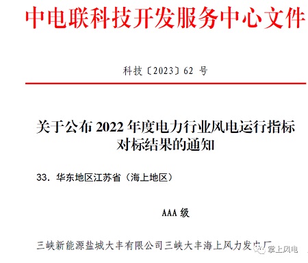 近日,中国电力企业联合会公布2022年度全国风电场生产运行统计指标对标结果,三峡新能源盐城大丰有限公司下辖的三峡大丰海上风力发电厂,以其领先的场站设备管理水品,稳定的风机运行状态,优异的生产数据从众多风电场中脱颖而出,荣获华东地区江苏省(海上地区)AAA级风电场。