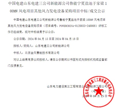 4月15日,中国电建山东电建三公司新能源公司鲁能宁夏盐池于家梁100MW风电项目其他风力发电设备采购项目入围公示,中标人为北京金风慧能技术有限公司。
