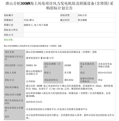 近日,河北省招标投标公共服务平台发布《唐山合桓300MW海上风电项目风力发电机组及附属设备(含塔筒)采购招标计划公告》。公告显示,唐山合桓300MW海上风电项目位于唐山市东南面海域,涉海面积为32k㎡,离岸距离约为20km,水深位于17.0m~20.0m之间,规划装机容量30万kW。该项目总投资290901.86万元。招标内容与范围:36台单机容量8.5兆瓦风力发电机组设备、附属设备(含塔筒)以及伴随服务,总容量300MW。招标估算额:105000万元。