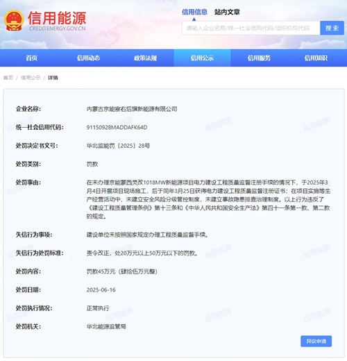 3、华北监能罚〔2025〕28号处罚决定书显示,内蒙古京能察右后旗新能源有限公司在未办理京能蒙西灵改1018MW新能源项目电力建设工程质量监督注册手续的情况下,于2025年3月4日开展项目现场施工,后于同年3月25日获得电力建设工程质量监督注册证书;在项目实施等生产经营活动中,未建立安全风险分级管控制度,未建立事故隐患排查治理制度。以上行为违反了《建设工程质量管理条例》第十三条和《中华人民共和国安全生产法》第四十一条第一款、第二款的规定,华北能源监管局对其作出罚款45万元处罚。