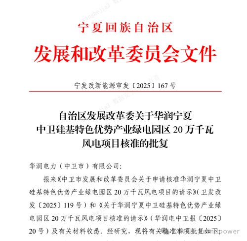 掌上风电消息,2025年9月24日,华润电力宁夏公司成功取得华润宁夏中卫硅基特色优势产业绿电园区200MW风电项目的核准批复。该项目规划总装机容量200MW,预计总投资约9.34亿元,选址于中卫市海原县关庄乡、红羊乡,该区域风能资源丰富、地质条件稳定,具备良好的风电开发基础。