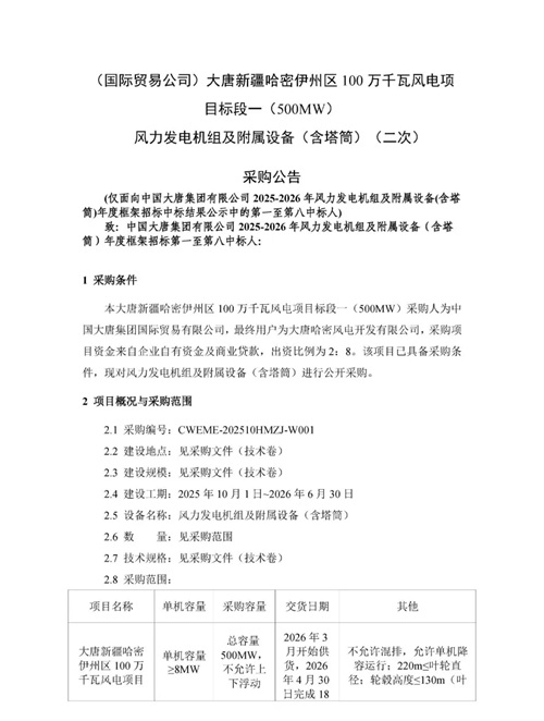 日前,大唐新疆哈密伊州区 100万千瓦风电项目标段一(500MW)风力发电机组及附属设备(含塔筒)(二次)采购招标,详情如下: