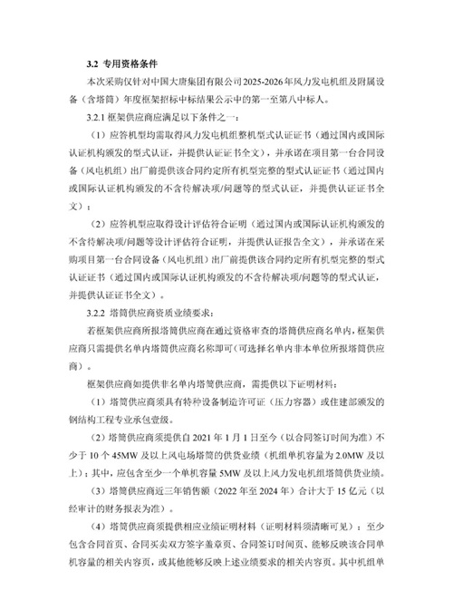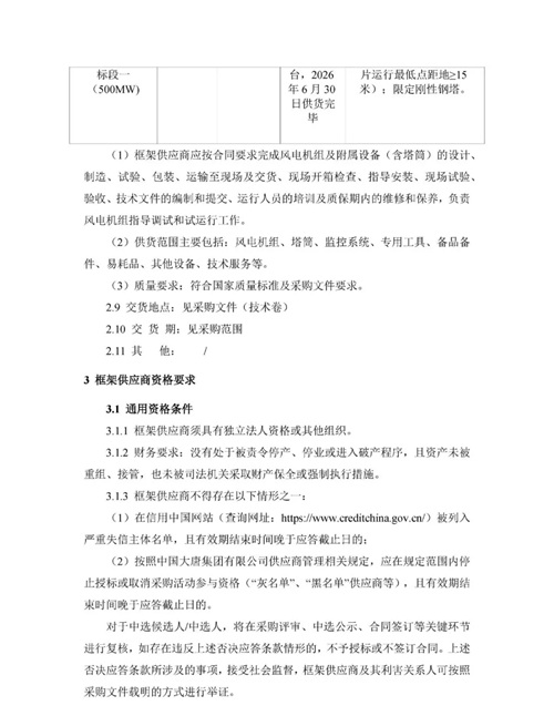 项目名称:大唐新疆哈密伊州区 100万千瓦风电项目标段一(500MW),单机容量≥8MW,总容量500MW,不允许上下浮动,交货日期:2026年 3月开始供货,2026年 4月 30日完成 18台,2026年 6月 30日供货完毕,要求:不允许混排,允许单机降容运行;220m≤叶轮直径;轮毂高度≤130m(叶片运行最低点距地≥15米);限定刚性钢塔。
