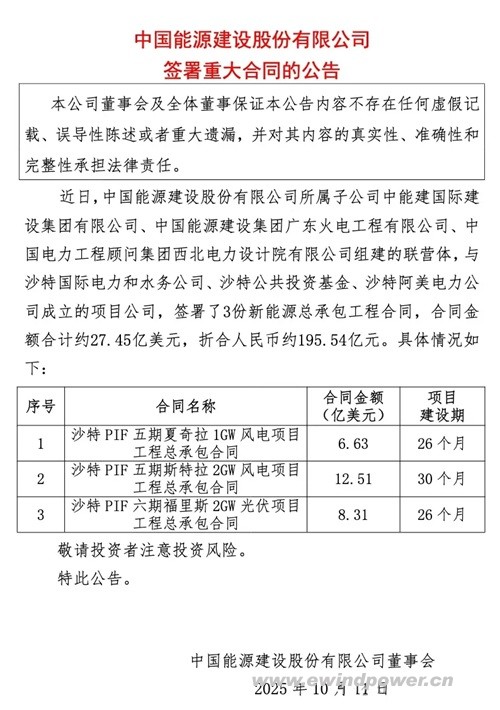近日,中国能源建设集团有限公司(简称“中国能建”)在海外市场再传捷报,成功签署沙特阿拉伯公共投资基金(PIF)旗下的两个大型风电项目EPC总承包合同。夏奇拉1GW风电项目与斯特拉2GW风电项目合同总金额达19.14亿美元(约合136.56亿元人民币),总装机容量高达3GW。这一超级大单不仅是中国能建在海外新能源EPC领域的重大突破,更标志着中国风电产业在沙特乃至整个中东市场迈出了历史性的一步,为“一带一路”倡议与沙特“2030愿景”的绿色对接树立了典范。