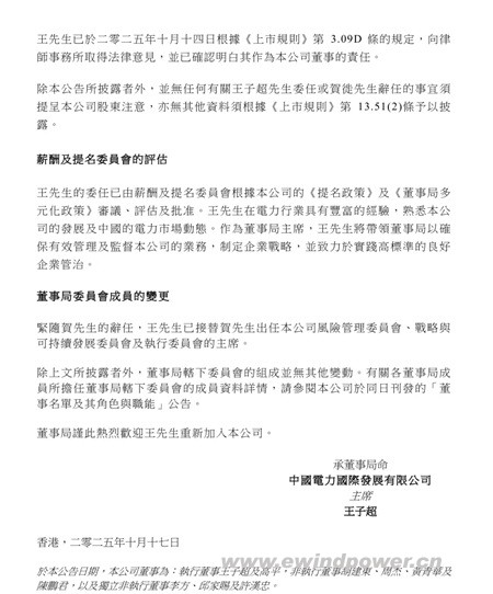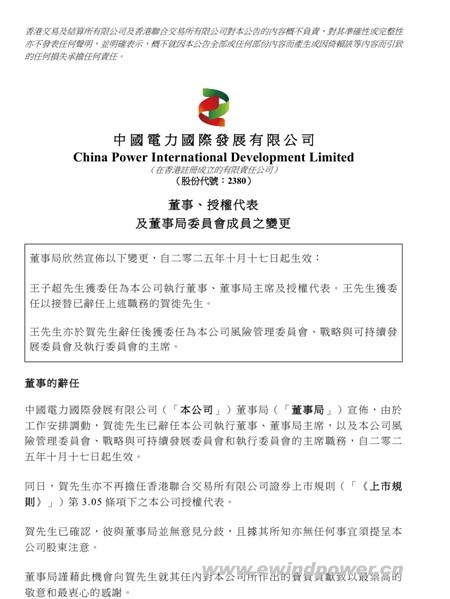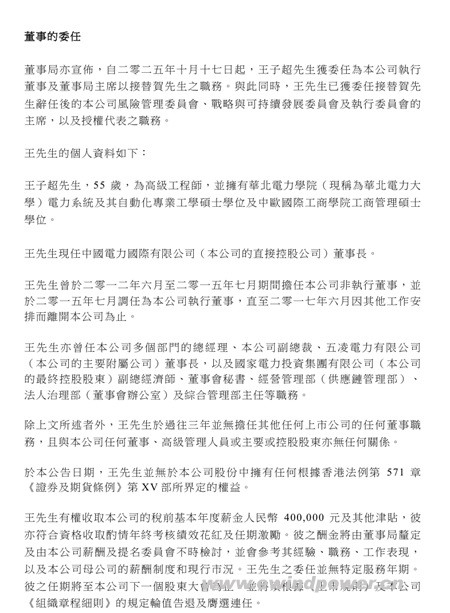 | • 中国电力董事局主席调整 | • 黄晨任上海电力总经理 |