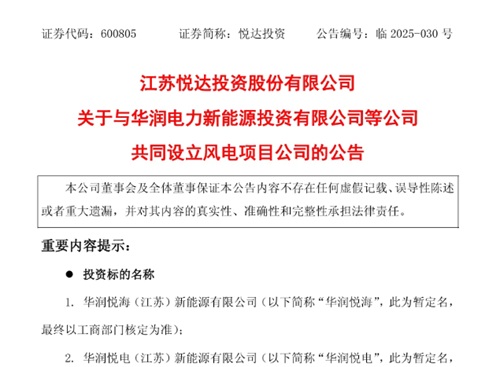 根据公告,悦达投资已于10月24日召开董事会审议通过相关议案。其中,响水308MW海上风电项目将由华润悦海(江苏)新能源有限公司(暂定名)负责开发,该公司注册资本10亿元,悦达投资持股20%,出资2亿元;合作方包括华润电力、黄海金控、欣昊装备及远景能源。另一项目——射阳407MW海上风电项目,则由华润悦电(江苏)新能源有限公司(暂定名)推进,注册资本13亿元,悦达投资持股30%,出资3.9亿元,合作方包括华润电力、长风装备和远景能源。