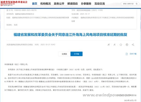 掌上风电消息,10月21日,福建省发改委正式批复同意连江外海海上风电场项目核准文件有效期延长一年。这一装机容量达700兆瓦的重大海上风电项目,因部分开工审批手续未能在原核准期内办结而获得延期许可,为项目推进赢得关键窗口期。