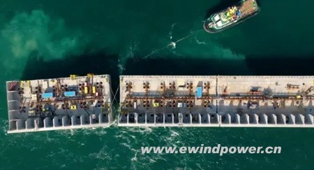 本次海上作业历时数月,共投入超过15艘特种作业船舶及300余名专业人员协同奋战。作为能源岛的防护主体,沉箱堪称工程的“钢铁城墙”——单体重达约22000吨,长57米、宽30米、高30米,规模堪比一座多层建筑。这些庞然大物在复杂海况下被逐一安放,构筑起坚实的防波屏障,为后续岛上升压站、变电设备等关键电力设施提供稳定可靠的建设环境。