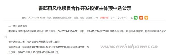 根据竞争性比选公告,霍邱县拟整合全县风电资源开发,统筹推进项目建设。经初步摸排,全县可开发风电资源约1GW。此次通过公开竞争性比选方式选择投资主体合作实施,本次合作开发项目规模以580MW为上限。