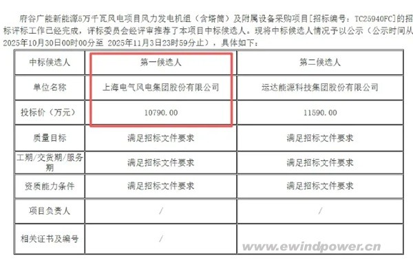 掌上风电消息,10月29日,粤易采阳光招标平台发布公示,电气风电成功预中标“府谷广能新能源5万千瓦风电项目风力发电机组(含塔筒)及附属设备采购项目”,以第一中标候选人的身份锁定这笔大单。