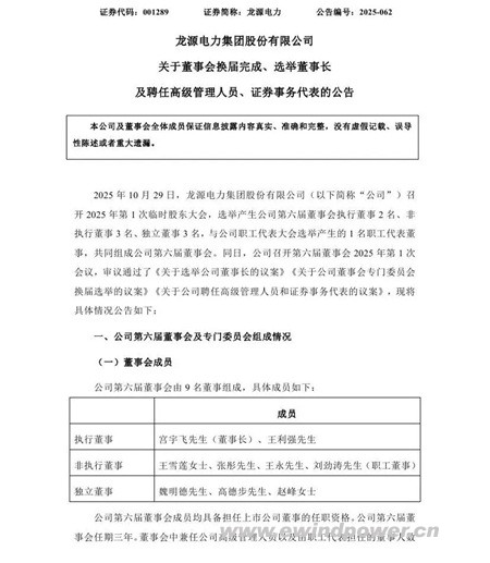 掌上风电消息,2025年10月29日,龙源电力召开新一届董事会会议,选举宫宇飞为第六届董事会董事长,并宣布继续聘任王利强担任总经理,杨文静担任总会计师,丁鶄担任副总经理兼董事会秘书,夏晖、王琦、李星运、史文义担任副总经理。此次换届保持了核心管理团队的稳定性,体现了公司战略的延续性。