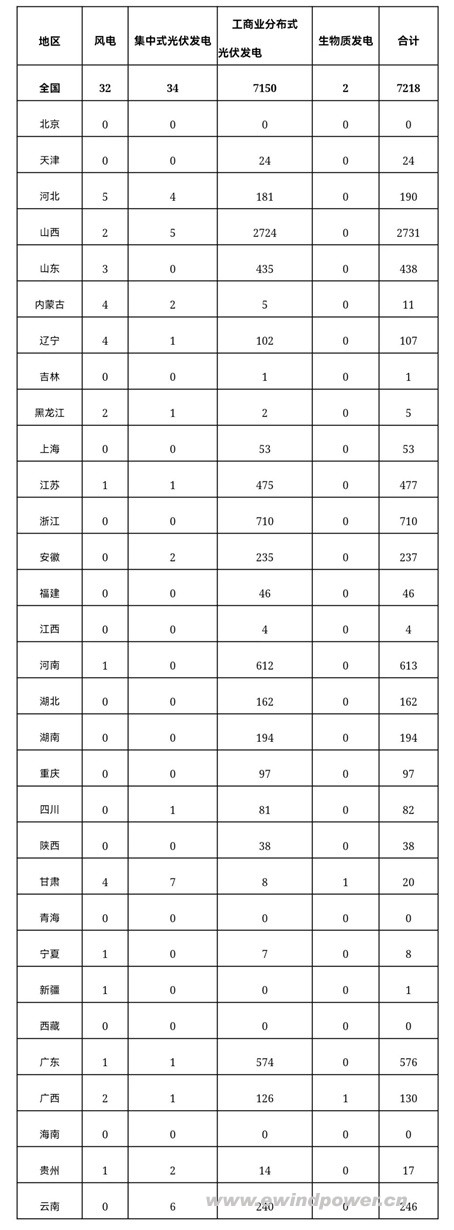 2025年9月,全国新增建档立卡新能源发电(不含户用光伏)项目共7218个,其中风电项目32个,光伏发电项目7184个(集中式光伏发电项目34个,工商业分布式光伏发电项目7150个),生物质发电项目2个。风电、集中式光伏发电、生物质发电项目清单见附件,工商业分布式光伏发电项目清单详见国家可再生能源发电项目信息管理平台网站(网址https://jdlk.renewable.org.cn/card-info-sheet/)。