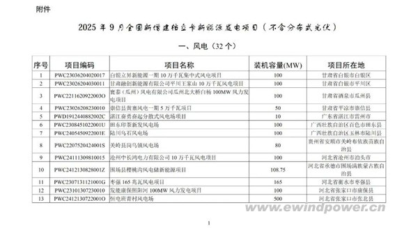 掌上风电消息,10月31日,国家能源局正式发布《2025年9月全国新增建档立卡新能源发电(不含户用光伏)项目情况公告》,为风电行业带来了一份值得关注的数据“成绩单”。公告显示,2025年9月,全国新增建档立卡新能源发电项目共计7218个,其中风电项目虽数量不多,仅有32个,但总装机规模达到3280.45MW(约3.28GW),展现出单项目规模大、集中开发力度强的特点。