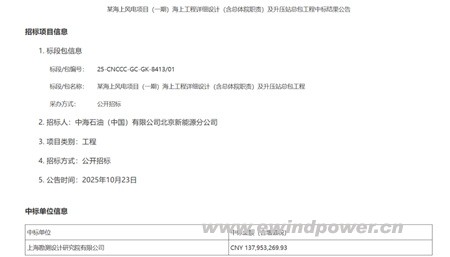 掌上风电消息,近日,中国海油供应链数字化平台发布重磅公告,宣告其某海上风电项目(一期)海上工程详细设计及升压站总包工程中标结果尘埃落定。国内新能源设计领域的领军企业——上海勘测设计研究院有限公司(以下简称“上海院”) 成功中标,中标金额高达 1.38亿元。这一关键节点的落定,标志着这一位于海南省西侧海域的巨型风电项目即将进入全面实质建设阶段。