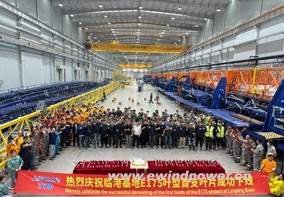 作为Enercon的战略级产品,E175系列叶片被布局于艾郎科技位于上海临港的智能化生产基地。项目启动以来,临港基地各部门高效协同、全力推进,结合艾郎总部资源支持,以及Enercon德国技术团队与本地团队的深度参与,确保首支叶片如期高质量完成脱模,展现出艾郎科技在高端叶片制造领域的综合实力与响应速度。