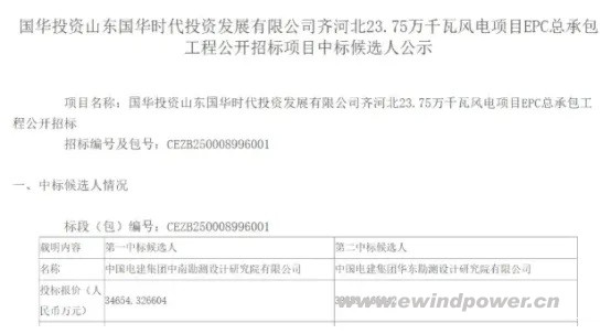 国华山东237.5MW平原风电项目EPC开标,中国电建中南院报价3.47亿元预中标​