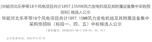 掌上风电消息,11月4日,华能电子商务平台发布《华能河北乐亭等18个风电项目共计1897.15MW风力发电机组及其附属设备集中采购预招标(标段一、四、五)》中标候选人公示,标志着这一备受行业关注的风电项目招标取得重要进展。