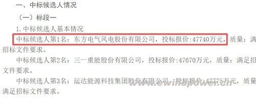 其中,标段一(350MW)第一中标候选人为东方风电,投标报价为47740万元;