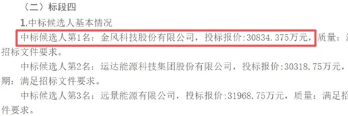 标段四(206.25MW)第一中标候选人为金风科技,投标报价30834.375万元;