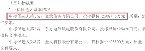 标段五(200MW)第一中标候选人为远景能源,投标报价25087.5万元。