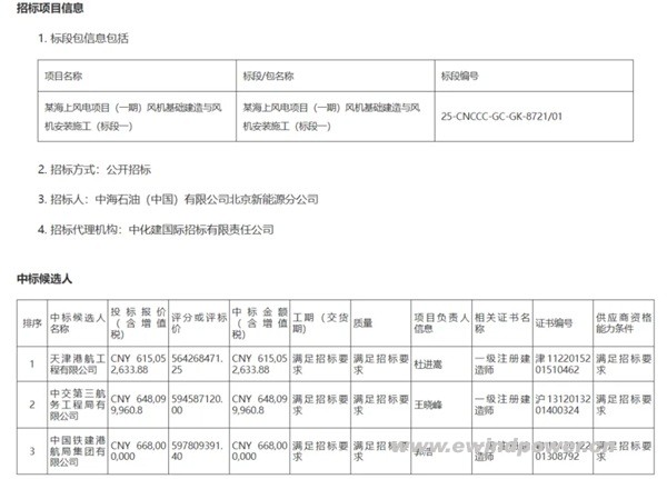 掌上风电消息,近日,中国海洋石油集团有限公司采办业务平台发布《某海上风电项目(一期)风机基础建造与风机安装施工(标段一)中标候选人公示》,天津港航工程有限公司以约6.15亿元报价成为第一中标候选人,中标结果引发行业关注。