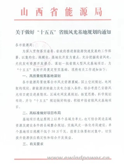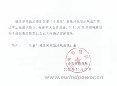 掌上风电消息,10月27日,山西省能源局正式发布《关于做好“十五五”省级风光基地规划的通知》,明确“十五五”期间省级风光基地规划建设的总体要求,提出单个基地规模不低于50万千瓦,原则上以县域为单元实施风光一体化开发,并允许跨县域整合资源,推动新能源集约化、规模化发展。