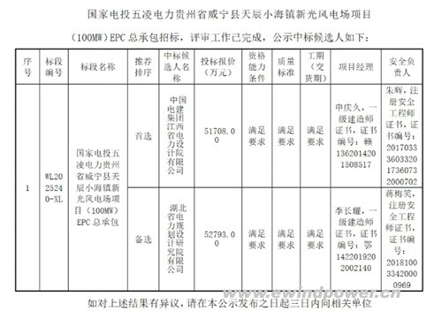 掌上风电消息,11月4日,国家电投电子商务平台正式公示了“五凌电力贵州省威宁县天辰小海镇新光风电场项目(100MW)EPC总承包”中标候选人。中国电建集团江西省电力设计院有限公司以5.17亿元报价成为首选中标单位,湖北省电力规划设计研究院有限公司以5.28亿元报价列为备选。