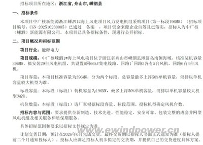 掌上风电消息,11月4日,中广核新能源正式发布浙江嵊泗1#海上风电项目风力发电机组采购招标公告,总装机规模396MW,分为两个标段公开招标。这一位于舟山嵊泗县滩浒岛南侧海域的项目,标志着华东沿海海上风电建设进入新一轮加速期。