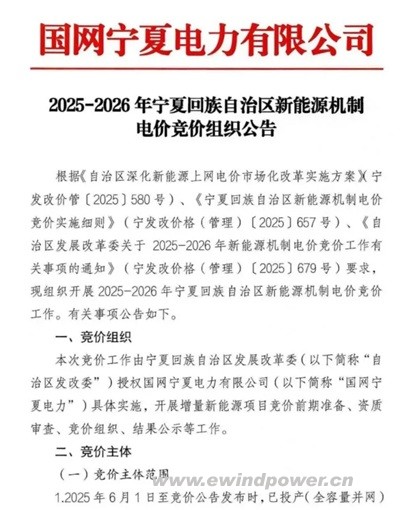 掌上风电消息,2025年11月6日,国网宁夏电力公司正式发布《2025-2026年宁夏回族自治区新能源机制电价竞价组织公告》,启动新一轮新能源项目机制电价申报工作。根据公告,2025年6月1日至公告发布期间已全容量并网、以及承诺在2026年12月31日前投产的新能源项目均可参与竞价,申报时间为11月6日至11月12日,预计11月28日完成出清。