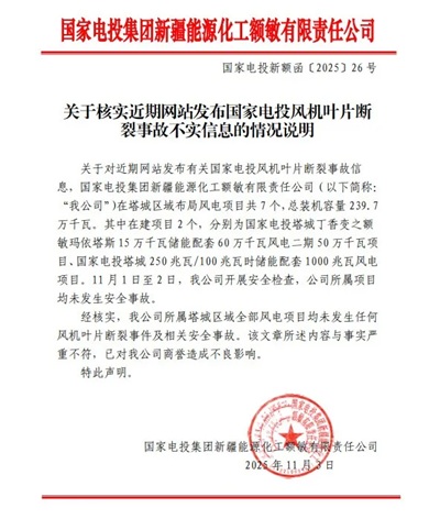 为强化安全管理,该公司于11月1日至2日组织开展了专项安全检查。经全面核实,塔城区域所有风电场机组运行平稳,未发生风机叶片断裂或其他相关安全事故。网络文章中所谓“事故”内容与事实严重不符,不仅误导公众,也对企业的商业信誉造成了不良影响。