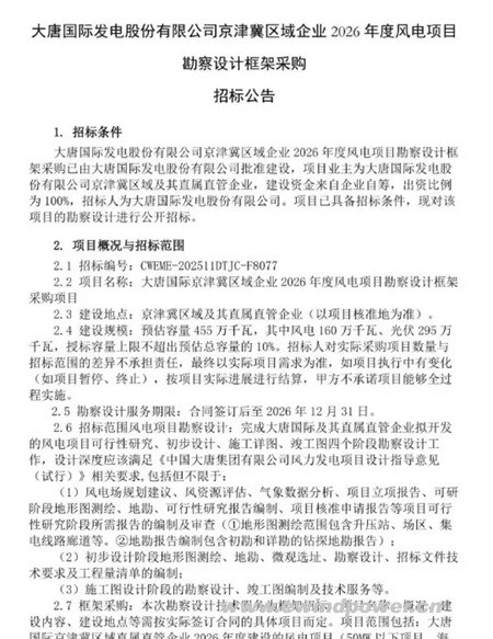 掌上风电获悉,近日,大唐国际发电股份有限公司正式发布京津冀区域企业2026年度风电、光伏项目勘察设计框架集中采购招标公告。本次招标预估总容量达455万千瓦,其中风电160万千瓦、光伏295万千瓦,是京津冀地区今年以来规模领先的新能源前期勘察设计招标项目之一。