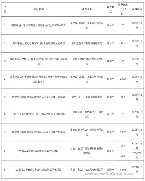此次公示的9个项目中,涵盖国家电投、国家能源集团、华能、三峡等多家能源企业开发建设的海上风电场,分布烟台、威海、潍坊沿海地区。其中,规模最大的为国家电投山东半岛南海上风电基地V场址500MW项目,补贴容量达50万千瓦;山东海卫半岛南U场址450MW项目紧随其后,补贴规模为45.05万千瓦。