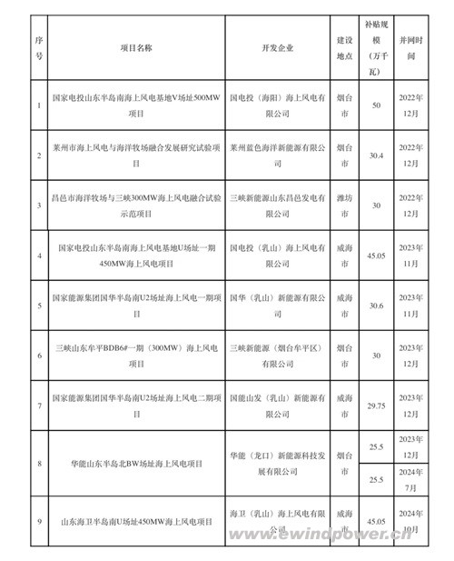 本次公示的9个项目业主单位涵盖国家电投、三峡集团、国家能源集团、华能集团等多家能源央企,项目分布于山东半岛的烟台、威海、潍坊等沿海地区。其中,规模最大的为国家电投山东半岛南海上风电基地V场址500MW项目,补贴核准容量达50万千瓦;山东海卫半岛南U场址450MW项目位列第二,补贴规模为45.05万千瓦。