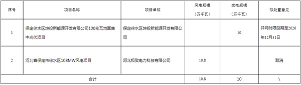 其中,河北省保定市徐水区108MW风电项目,规模10.8万千瓦,项目单位为河北极致电力科技有限公司,拟处置意见为取消。
