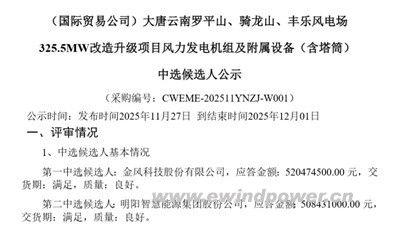公示显示,金风科技为大唐云南罗平山、骑龙山、丰乐风电场325.5MW改造升级项目的中标候选人第一名,投标报价为5.2亿元,折合单价为1599元/kW。