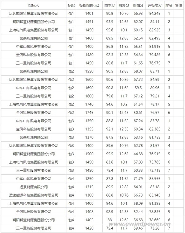 包4(8.X机型,500MW):中车山东风电,投标报价1250元/kW。