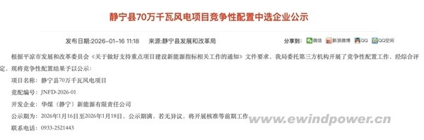 此次竞配编号为JNFD-2026-01。经过专业评审,华煤(静宁)新能源有限责任公司凭借其雄厚的集团背景、丰富的能源开发经验以及综合技术方案脱颖而出。目前,中选结果正处于公示阶段(2026年1月16日至1月18日)。公示期满且无异议后,项目将正式进入核准等前期工作流程,标志着这一风电“巨无霸”工程即将从蓝图迈向实质性建设阶段。