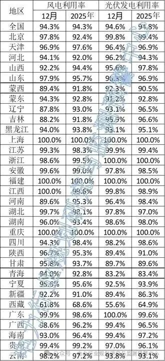 从整体趋势来看,2025年12月当月,全国风电利用率94.3%,光伏利用率94.6%,与全年水平基本持平,说明在年末发电高峰期间,全国新能源消纳整体保持稳定,未出现明显波动。
