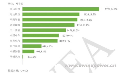 2025年风电整机制造企业新增吊装容量排名前五(单位:GW):