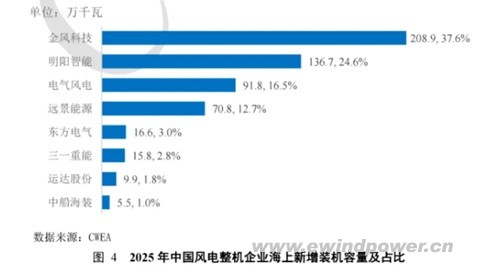 海上风电市场格局呈现出不同的竞争态势。2025年,共有8家整机商有海上新增装机。其中,金风科技以新增装机208.9万千瓦(占比37.6%)位居第一;明阳智能以新增136.7万千瓦(占比24.6%)位列第二。电气风电、远景能源、东方电气、三一重能、运达股份和中船海装六家企业合计分享了37.8%的市场份额。