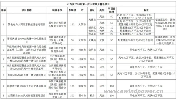 开年即冲刺!近日,山西省能源局正式下达《2026年第一批大型风光基地项目建设计划》,为全省新能源发展按下了“快进键”。本次共批复8个大型项目,总装机规模高达600万千瓦(6GW),阵容强大、看点十足。